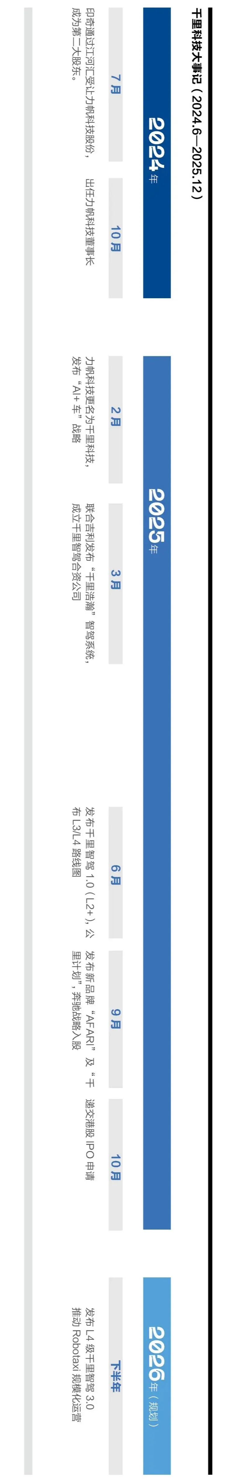 無數(shù)個大小決策下,團(tuán)隊幾乎每天都在搶時間,嚴(yán)格打表。一個18個月構(gòu)建三大AI解決方案的具體規(guī)劃,精準(zhǔn)聚焦三條業(yè)務(wù)線:1.千里智駕(L2+—L4級智駕方案);2.千里智艙(自然交互座艙體驗);3.千里智行(Robotaxi)加快完成全鏈路產(chǎn)業(yè)布局。